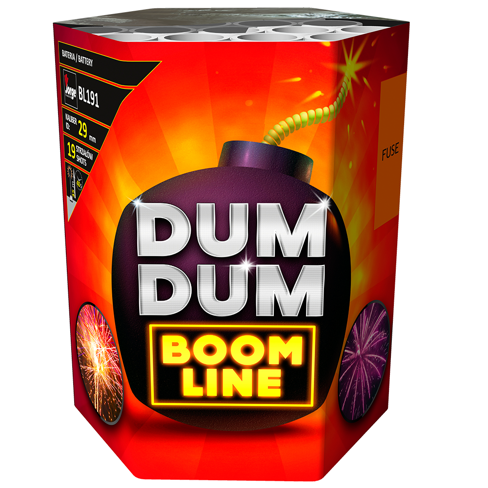 DUM DUM box BL191 vatrometa proizvođača Jorge fireworks iz Poljske. Efekti: Srebrasti kokos + crvene zvezde + srebrni rep. Crveni kokos + zelene zvezde + srebrasti rep. brokatna kruna + plave zvezde + zlatni rep. Zeleno drvo kokosa + žuti rep. zlatno kokosovo drvo + zeleni rep. Trajanje vatrometa : oko 40 sekundi. 19 pucnja, kalibar 30 mm.
