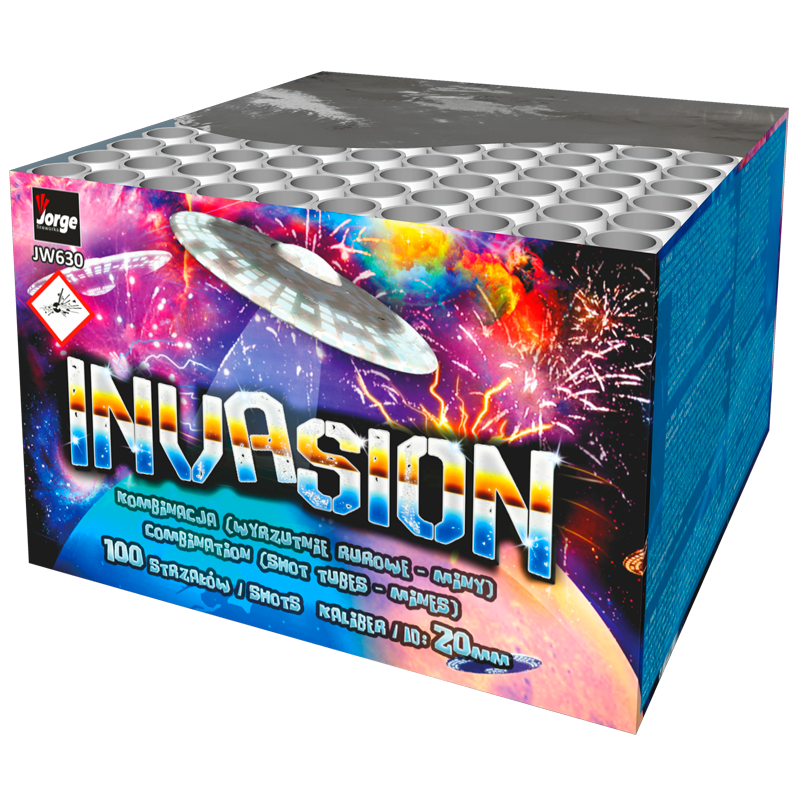 Invasion box JW630 vatrometa proizvođača Jorge fireworks iz Poljske. Trajanje vatrometa 45 sekundi, 100 pucnja. Opis efekata „Invazija“; srebrni puckajući cvet+breskve+ limun. Plavi+srebrni gliter sa plavim repom; crveni+srebrni gliter sa crvenim repom; brokat kruna+zeleni glitter sa zelenim repom. Crveni talas+vremenska kiša sa crvenim repom. Zeleni talas+vremenska kiša sa zelenim repom. Brokatna kruna+vremenska kiša sa plavim repom i srebrni glite